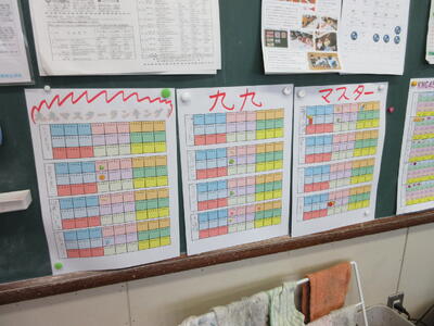 教室には、九九の掲示がたくさんあり、合格者にはシールが貼られています。