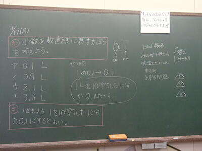 少数を数直線に表す方法を考える内容で、個人で考えたり、グループで話し合ったり、交流したりと楽しそうに学んでいました。