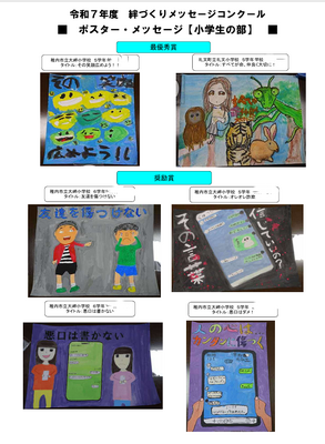 令和7年度『絆づくりメッセージコンクール』~いじめやネットトラブルの根絶を目指して~というコンクールで大岬小児童の作品が多数入選しました。入選した作品の展示会が以下のとおり行われています。