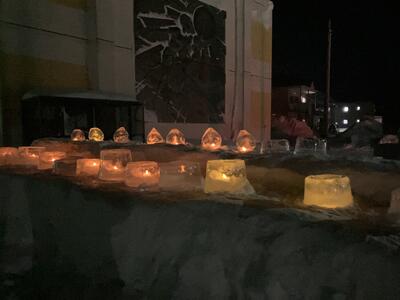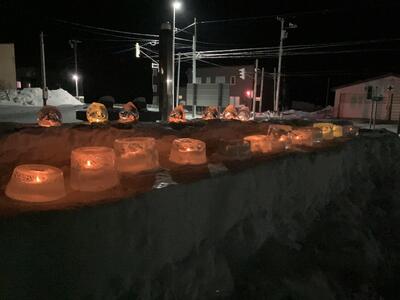 夜の大岬小。1・2年生が作ったアイスキャンドルが宗谷路を照らしています。