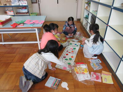 1年生が図工ですごろくをつくっていました。5時間目は元気に雪遊びをしていました。