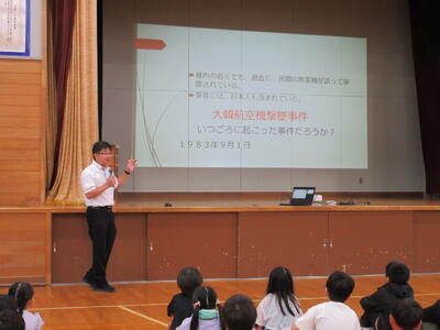 4~6年生を対象に、大韓航空機撃墜事件遺族会の山口真史さんに来ていただき、平和の授業をしていただきました。大韓航空機の事件をとおして、稚内の『子育て平和』について考える1時間でした。