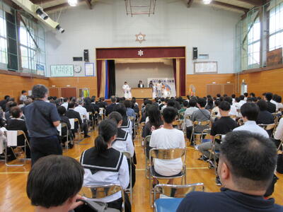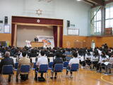 大岬小では全校朝会で校長先生から子育て平和の日について説明がありました。