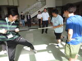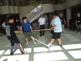 警察署の方々から指導を受けて、さすまたの使い方とバリケードの設置方法について実技研修を行いました。